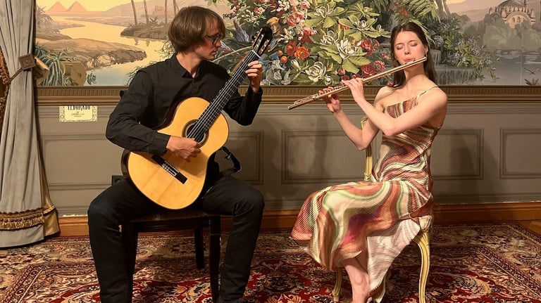 The concert is full of Spanish spirit, virtuosity and elegance. Two talented musicians perform a programme that combines elements of flamenco, Argentinian rhythms and tango. Dominyka is an extraordinary flautist, able to combine virtuosic, colourful and dynamic playing, movement and dance. Arthur's playing is highly expressive, and the musician himself enchants with his charisma, deep interpretations and explorations.
